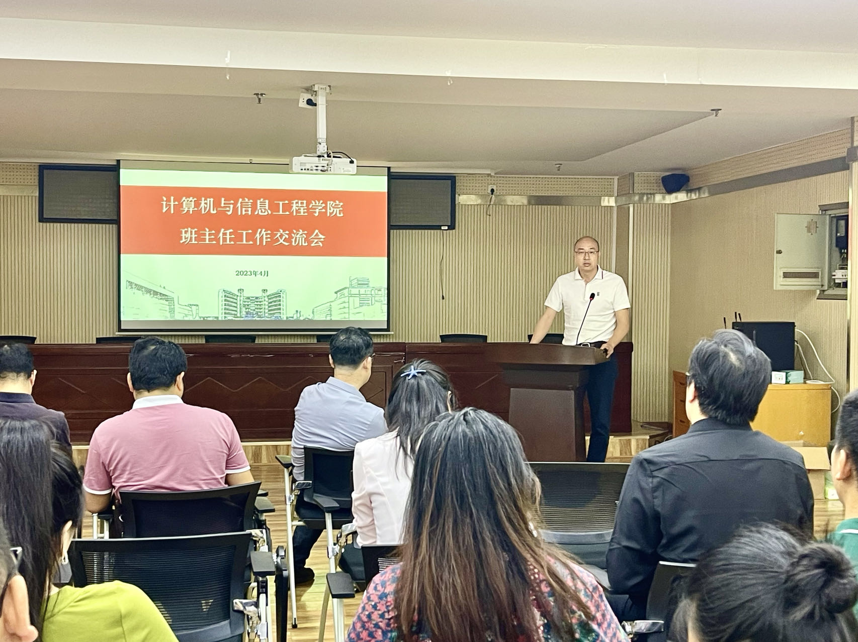 2023年4月20日,计算机与信息工程学院班主任工作交流会在求是楼709报告厅举行。计算机与信息工程学院党委书记李健林、党委副书记何伟以及全体班主任、辅导员老师参加,会议由何伟主持。