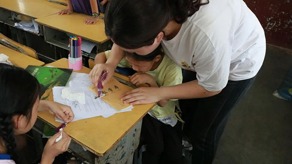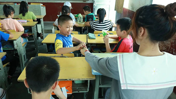 一班支教班主任陈婷老师说,每次手工课结束后,有些孩子总是会向手工老师多要一些彩纸,重新折这节课所学的内容,然后把折好的作品留给自己或送给其他老师,这让她总会感觉被满满的爱意包围。陈婷老师感慨,孩子们的眼神真的好清澈干净,没有那么多尘世繁琐,不管他们每次闹多大的矛盾,只要让他们互相说句对不起,下一秒又会和好如初;每当发生了难过的事情,给他们一个棒棒糖或者一个拥抱,下一秒又会哈哈大笑。二班支教班主任彭婷老师在谈起支教期间的感动时,她说“有一次一位女同学肚子疼,我第一时间把她背下了楼,放在躺椅上,喂她喝热水,给她揉肚子,陪她聊天,直到肚子不痛时,又为她梳头盘发。”的确,支教的意义也许就蕴藏在这些和学生相处的温暖日常里。三班支教班主任唐越老师回忆说,有一天早上他坐在操场边等学生来学校,突然二楼传来学生的稚嫩的声音,“唐老师——你吃早饭了吗?”当得知唐越老师还没有吃早餐时,学生方子宇把自己的包子掰开一半,连同一盒牛奶一起塞到唐越老师手里,然后就快速跑开了。拿着手里的牛奶和包子,唐越老师回忆时不禁感慨“支教时总是被一些不经意间的温暖所感动,被人惦记的感觉真好。”